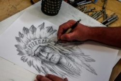 繊細で厳密な筆さばきで描いていきます。これは果てしない作業です。デザインは、アメリカの歴史に基づくもの、ネイティブインディアンやアメリカンイーグル、スカルやモーターバイクなどが多く、またタトゥーからの影響もあります。