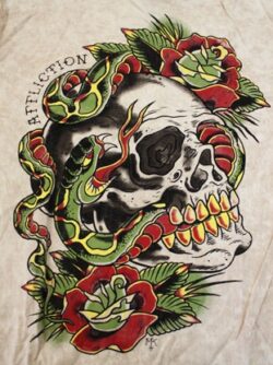 『タトゥーは、文化、スタイル、芸術、ファッションの融合です。タトゥーアーティストのインクは肌に刻み込み、表現の自由の証、個性の印、そして通過儀礼の勲章であり、芸術であります。』とAffliction Ten’s Anniversary のブックレットで Affliction(アフリクション)が語っています。