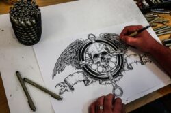 Affliction(アフリクション) のデザインは、すべて Affliction Clothing の専属デザイナーによるものです。このような感じで、実際ペンで白い紙に描いていきます。いきなりDTPソフトなどを利用してデザインをするのではありません。