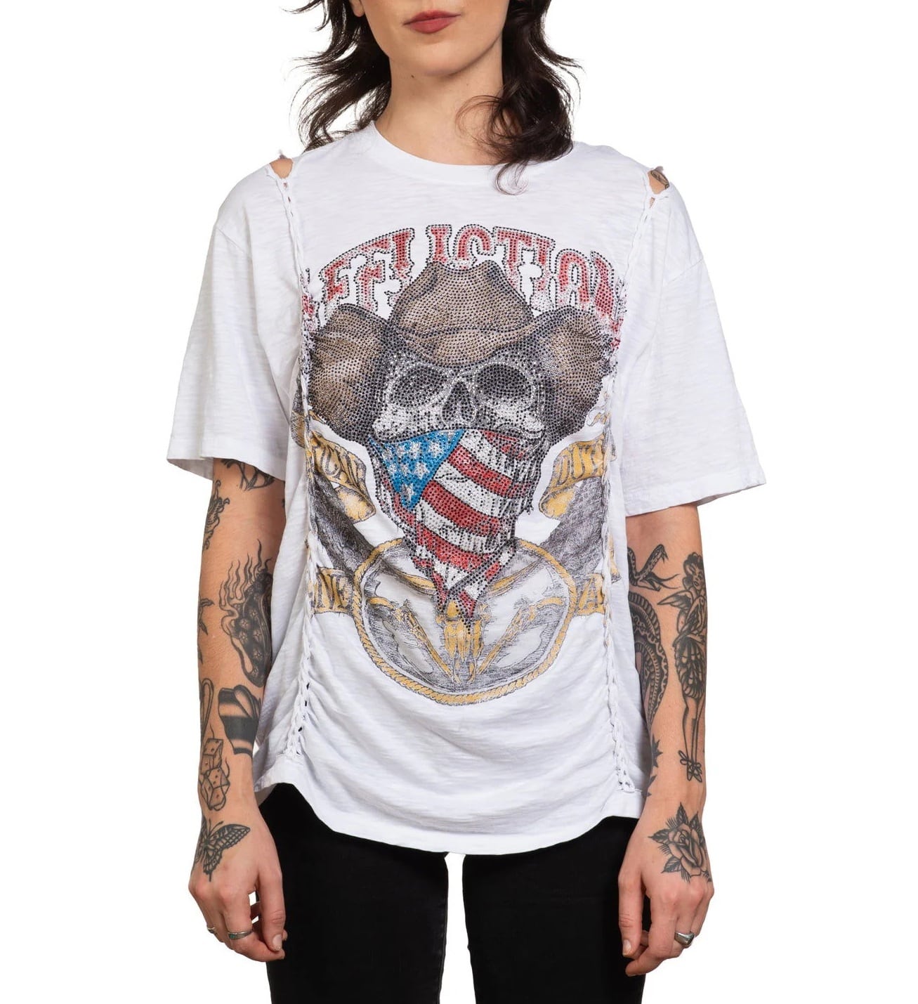 デザインは、スカル・バラ・ウィングといった精巧なグラフィックにラインストーンや特殊な箔プリントを施し、「悪党」や「反逆者」のスタイルを強調しています。