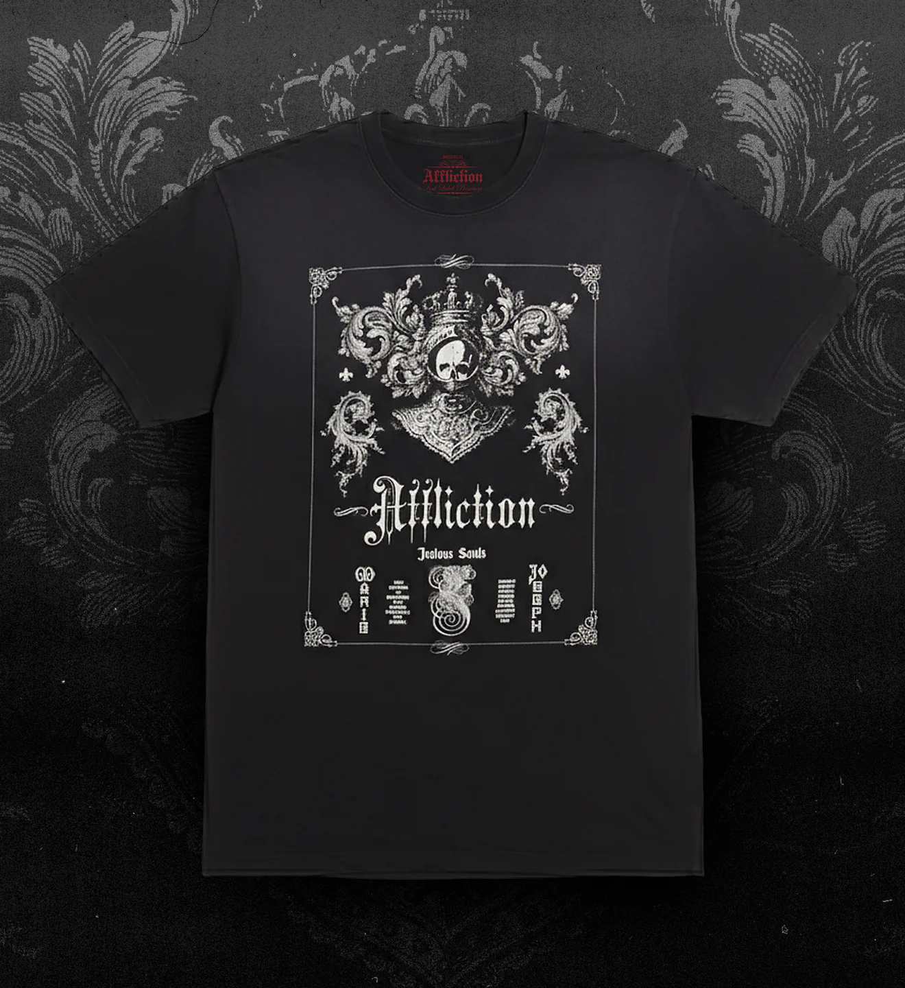 Affliction Black Labelは、高品質なコットン生地、特殊なインク、ラインストーン、箔、ユニークなパッチを使用し、バイカー・ロックンロール・タトゥー風のグラフィックに重点を置きました。